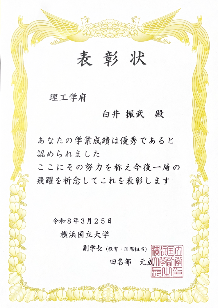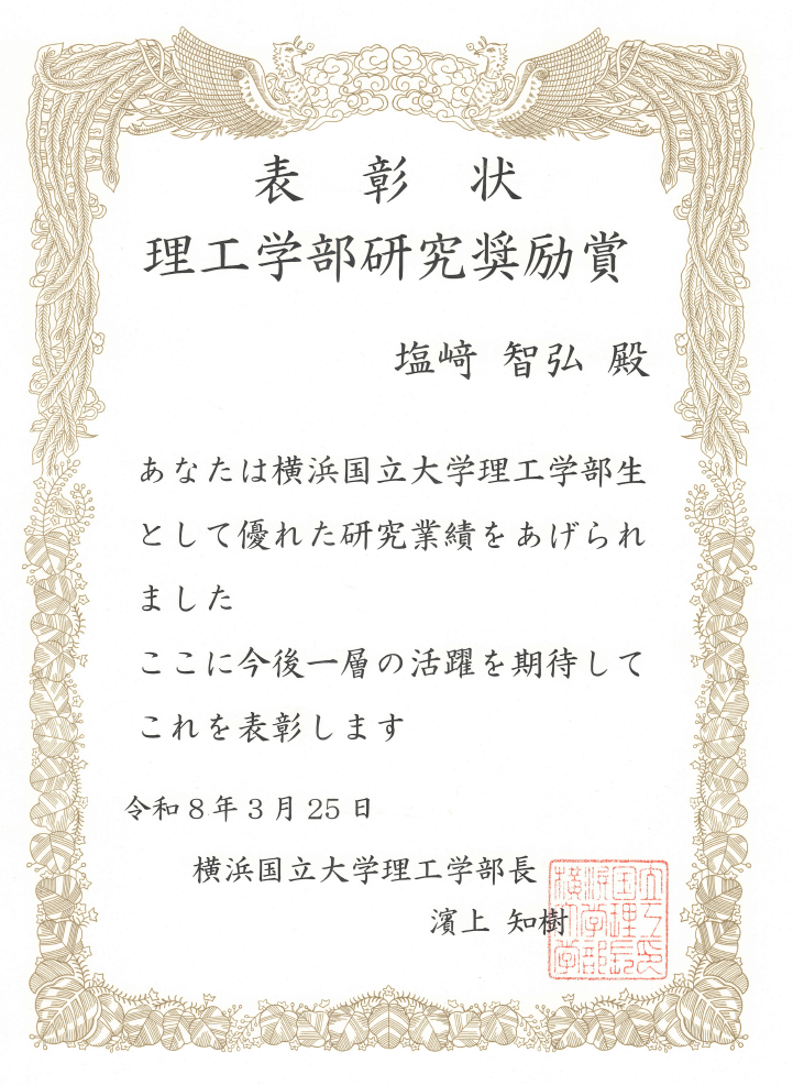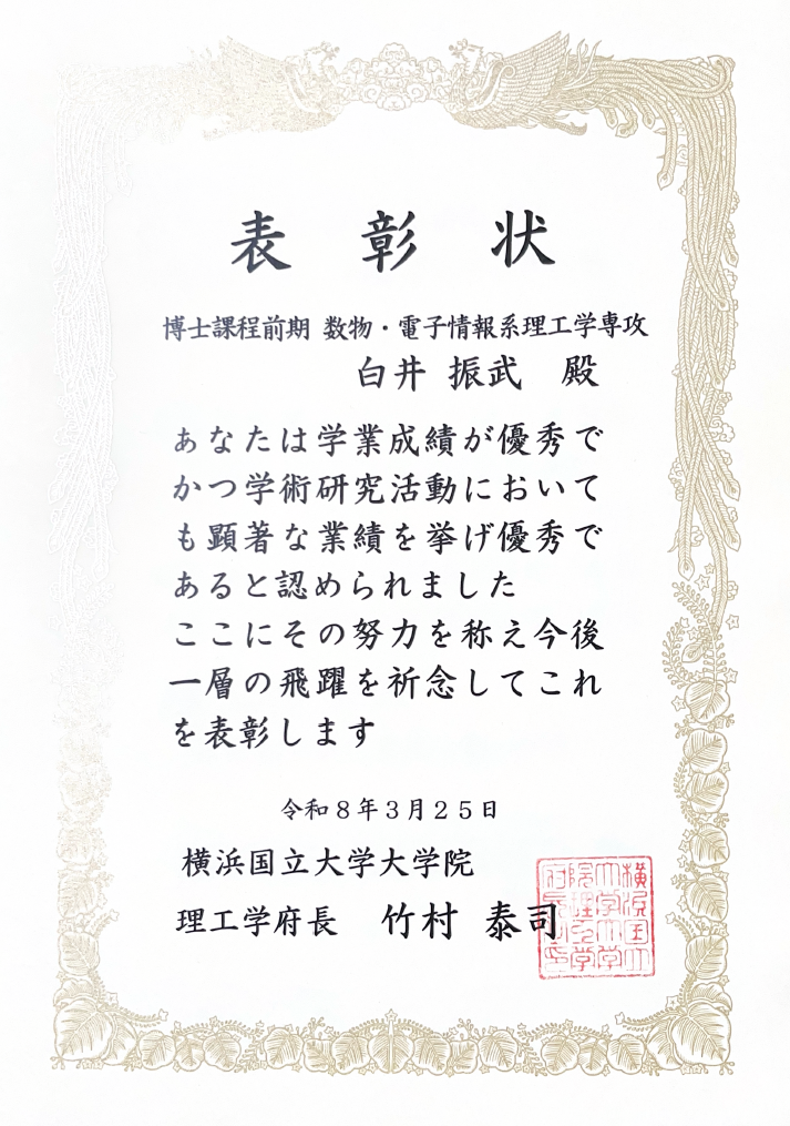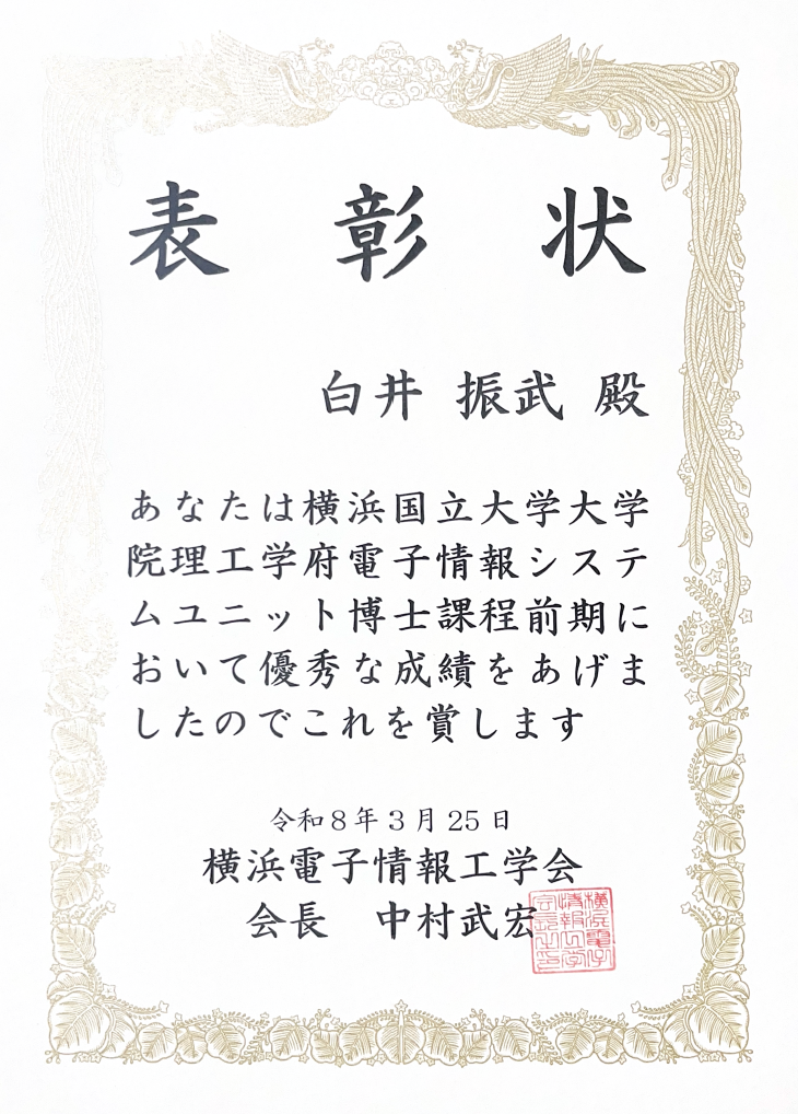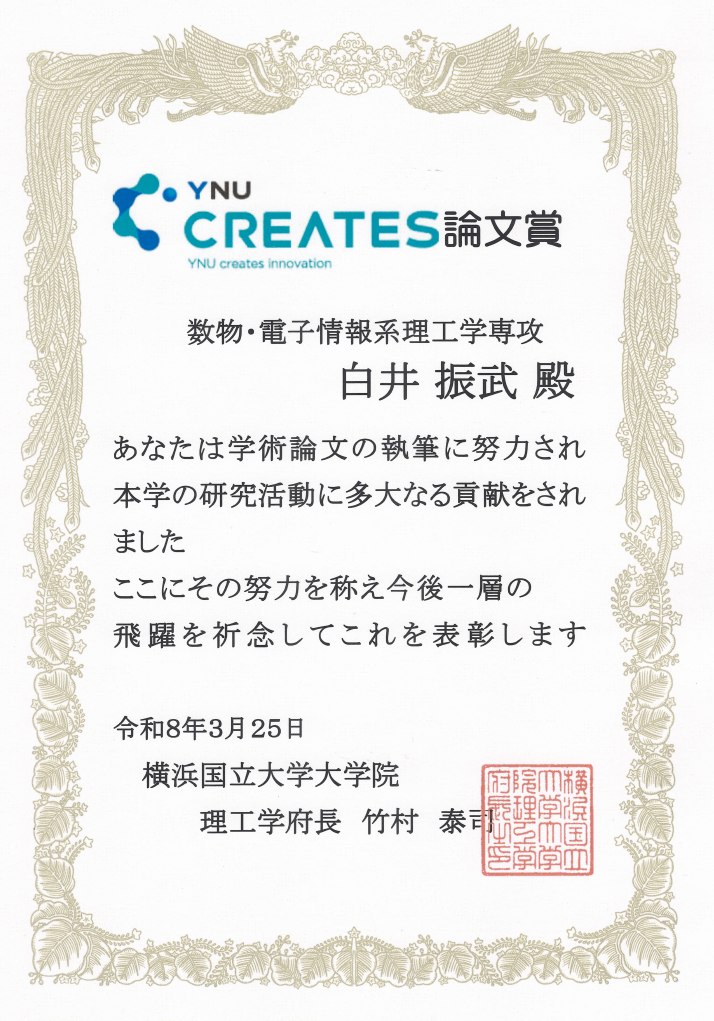 大学院では、白井君と比嘉君が博士課程前期をそれぞれ成績第1位・第5位で修了し、白井君は令和7年度の4つの学内賞:理工学府学生表彰・横浜電子情報工学会学生表彰・電子情報システムユニット成績優秀者表彰・CREATES論文賞 を、比嘉君も2つの学内賞:電子情報システムユニット成績優秀者表彰・CREATES論文賞を、それぞれ受賞しました。