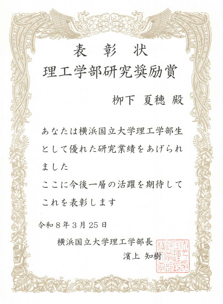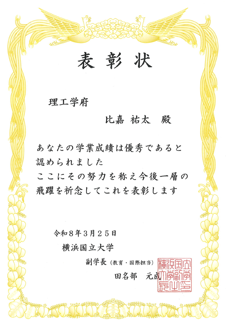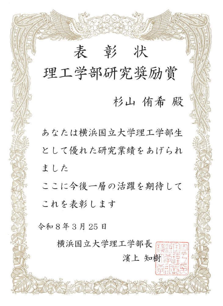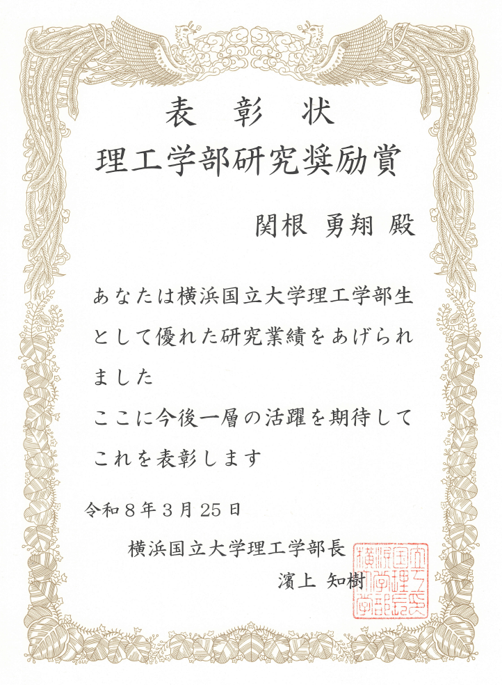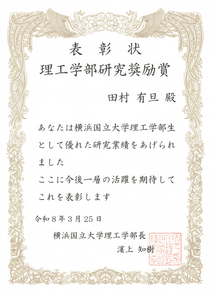 大学院では、白井君と比嘉君が博士課程前期をそれぞれ成績第1位・第5位で修了し、白井君は令和7年度の4つの学内賞:理工学府学生表彰・横浜電子情報工学会学生表彰・電子情報システムユニット成績優秀者表彰・CREATES論文賞 を、比嘉君も2つの学内賞:電子情報システムユニット成績優秀者表彰・CREATES論文賞を、それぞれ受賞しました。
