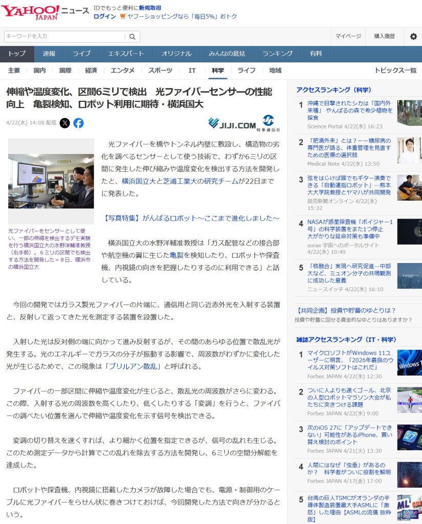 2026-04-22 / 最終更新日時 : 2026-04-23 y_mizuno メディア 研究成果が 「Yahoo!ニュース」などで紹介されました。 分布型光ファイバセンサで世界最高の空間分解能を達成した成果が、多くのニュースサイトで紹介されました。 Yahoo!ニュース (バックアップ) 他は後日掲載予定。